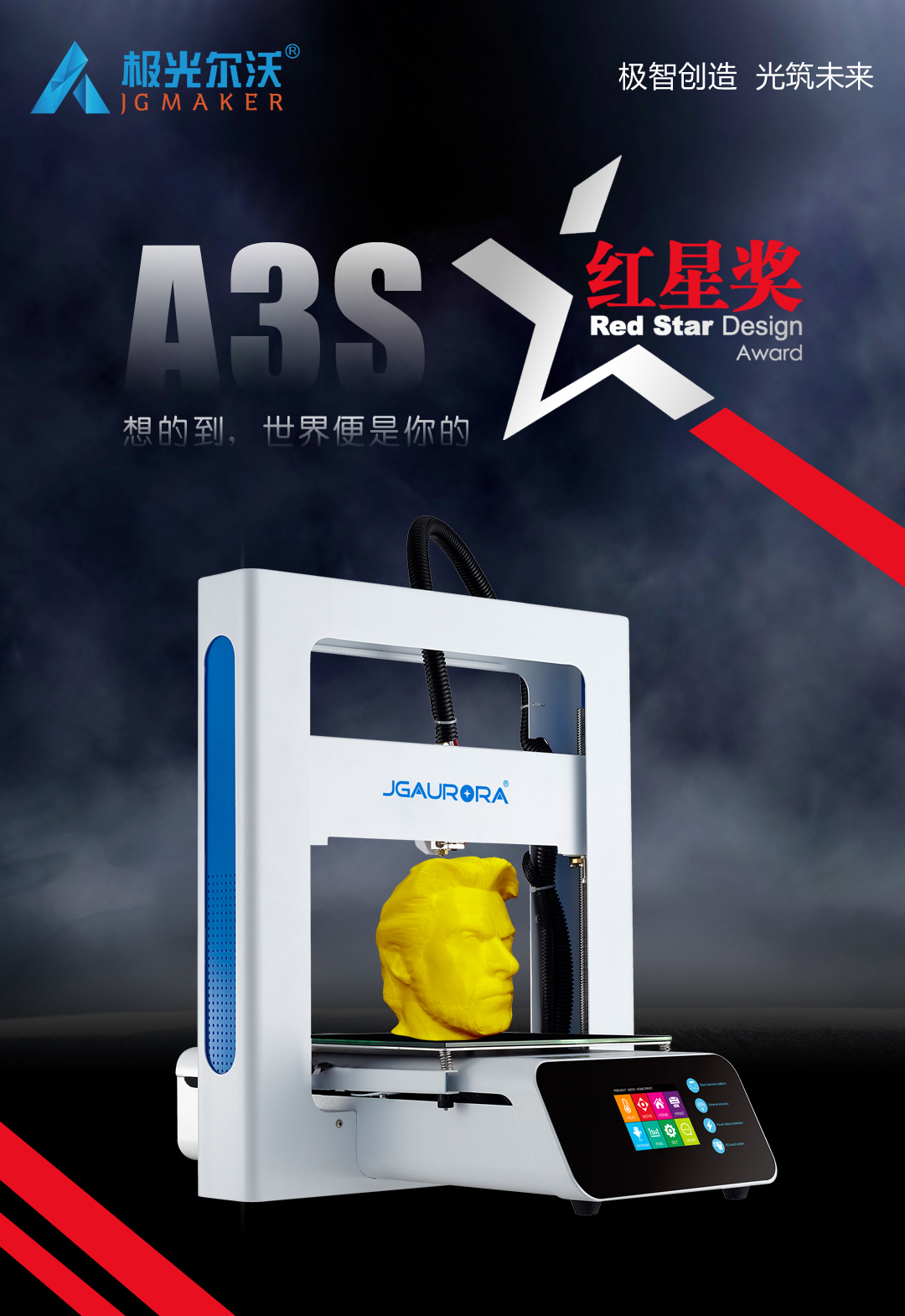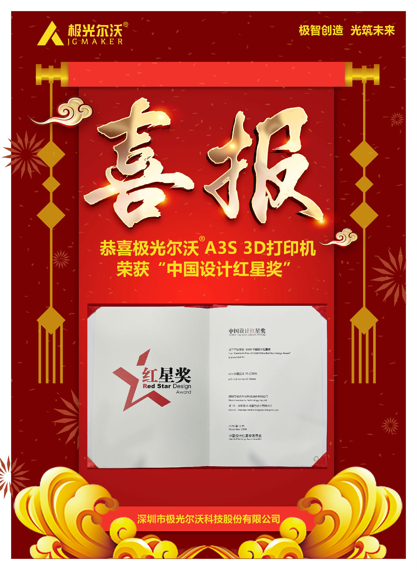 12月9日,2020中國設計紅星獎頒獎活動在北京舉行。2020年中國設計紅星獎以"融合的時代 凝聚的力量"為主題,來自全球5000家企業(yè)的7000余件產品參與角逐。極光爾沃A3S 3D打印機憑借新穎獨特的設計理念、簡潔純粹的產品形象從眾多產品中脫穎而出,獲得評委一致青睞,一舉拿下2020中國設計紅星獎。