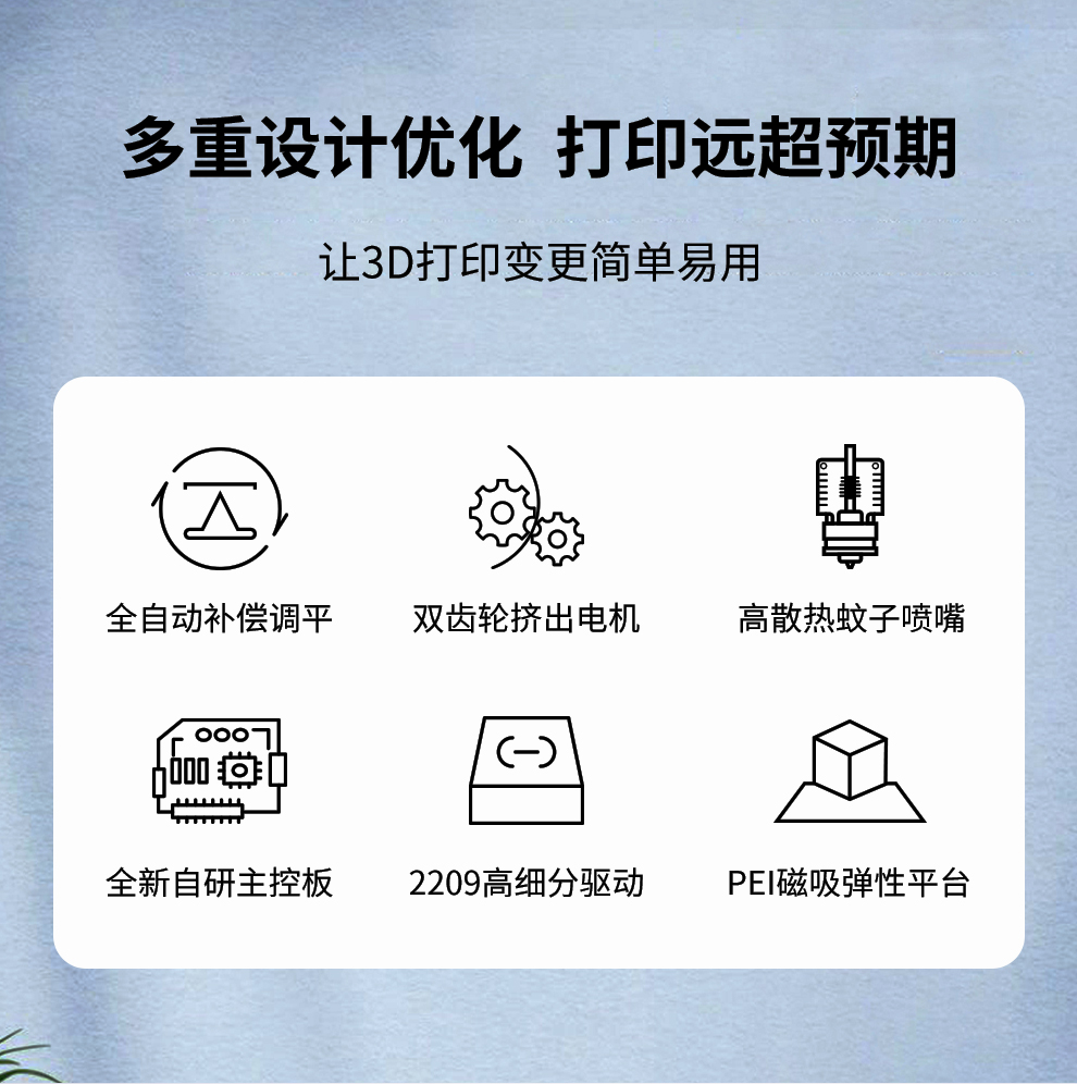 先進(jìn)熱感控制系統(tǒng),四軸靜音驅(qū)動(dòng)主板,搭載靜音風(fēng)扇,你可以享受到安靜無噪音的打印環(huán)境,同時(shí)為機(jī)體及時(shí)冷卻散熱,有效避免模型過熱變形等問題。