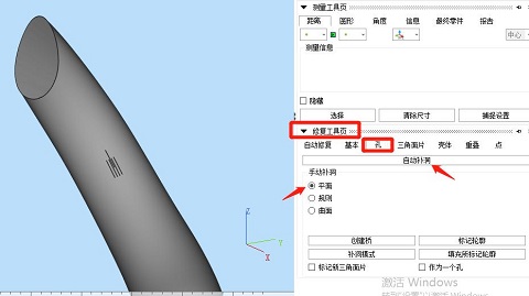 ④使用“修復(fù)工具頁(yè)”,選擇“孔”,選擇“平面”,對(duì)分割后的2個(gè)模型都進(jìn)行自動(dòng)補(bǔ)洞,也可以根據(jù)實(shí)際孔洞的起伏形狀來(lái)選擇“曲面”或“規(guī)則”來(lái)補(bǔ)洞。