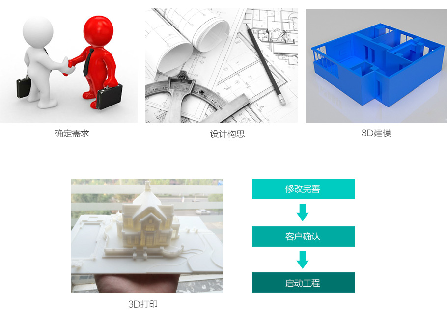 了解客戶需求→構(gòu)思設(shè)計→3D建?!?D打印出來→修改完善→客戶確認→啟動工程。